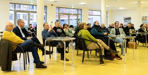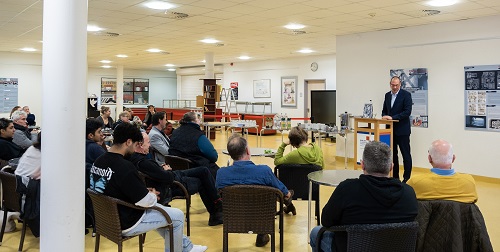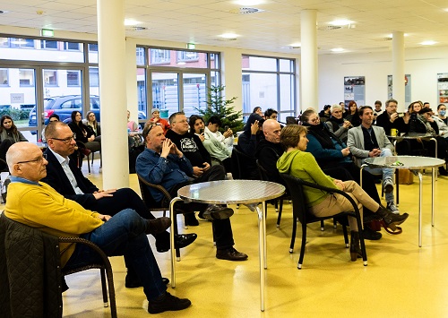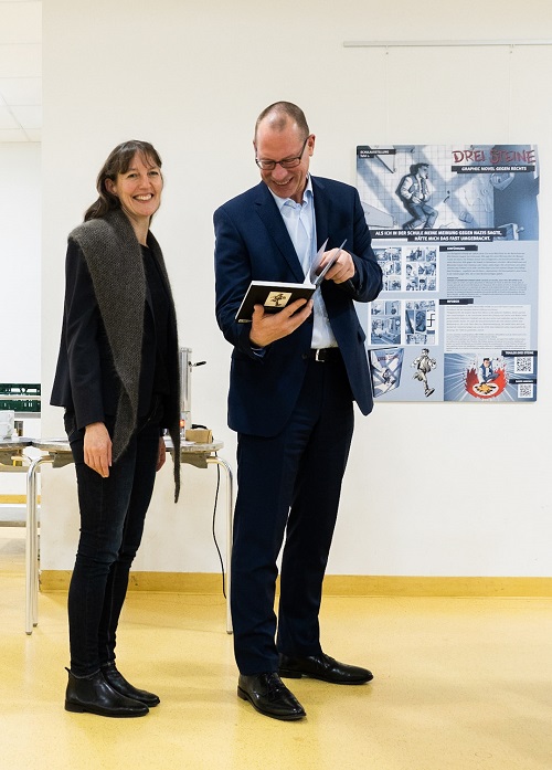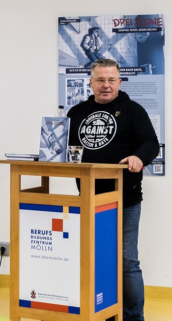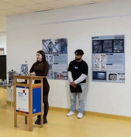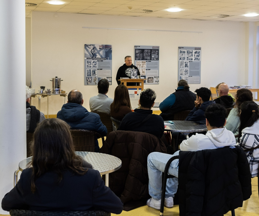 Anschließend führte uns Nils Oskamp durch die Ausstellung. Das Publikum, hauptsächlich Schülerinnen und Schüler der Abteilung Sozialpädagogik, hörten aufmerksam zu, bedrückt von dem persönlichen Charakter des Erzählten: Nils Oskamp wurde als 14-Jähriger Opfer rechtsradikaler Gewalt und erlitt eine posttraumatische Belastungsstörung, die er mit dem Schreiben seiner Graphic Novel Drei Steine heilen konnte.