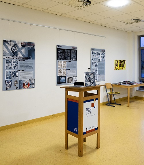 Nils Oskamp hat eine Schulausstellung auf elf bedruckten Tafeln entwickelt. Über QR-Codes sind Multimedia-Inhalte wie TV-Berichte, pädagogisches Begleitmaterial und Hilfsangebote verfügbar. Die Tafeln sind mehrsprachig (auf Deutsch, Französisch, Ukrainisch und auf Arabisch), so dass die vor kurzem geflüchteten Schülerinnen und Schüler die Inhalte verstehen können.