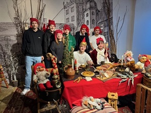 Probleme kennen wir nicht. Wir nehmen Herausforderungen an. Der Zug fährt kurzfristig nicht nach Plan -egal- nehmen wir halt den Bus. So startete unsere Fahrt am Mittwochmorgen. Mittags kamen wir in Kolding an und wurden nach einem kurzen Fußmarsch mit einem leckeren Sandwich am IBC empfangen. Gestärkt ging es zur Stadtrallye zum Thema „Nachhaltigkeit“ ins Zentrum, natürlich in deutsch-dänischen Gruppen. Danach ein Besuch im Kolding Hus, wo vieles schon weihnachtlich dekoriert war. Als Highlight konnte man Selfies mit historischer Kleidung und am